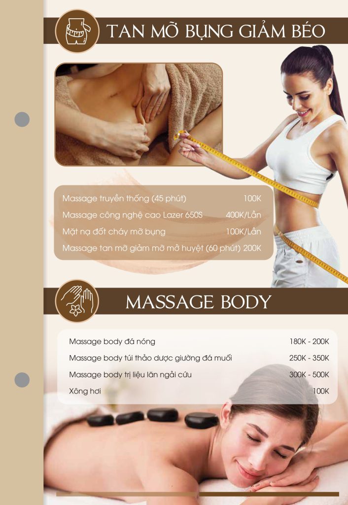 Khám phá bảng giá các dịch vụ giảm mỡ bụng (massage truyền thống, lazer công nghệ cao, mặt nạ đốt mỡ, massage mở huyệt) và massage body (đá nóng, túi thảo dược giường đá muối, trị liệu lăn ngải cứu, xông hơi) tại Bình Chánh, TP. Hồ Chí Minh do Ngọc Liên Spa đảm nhận.
